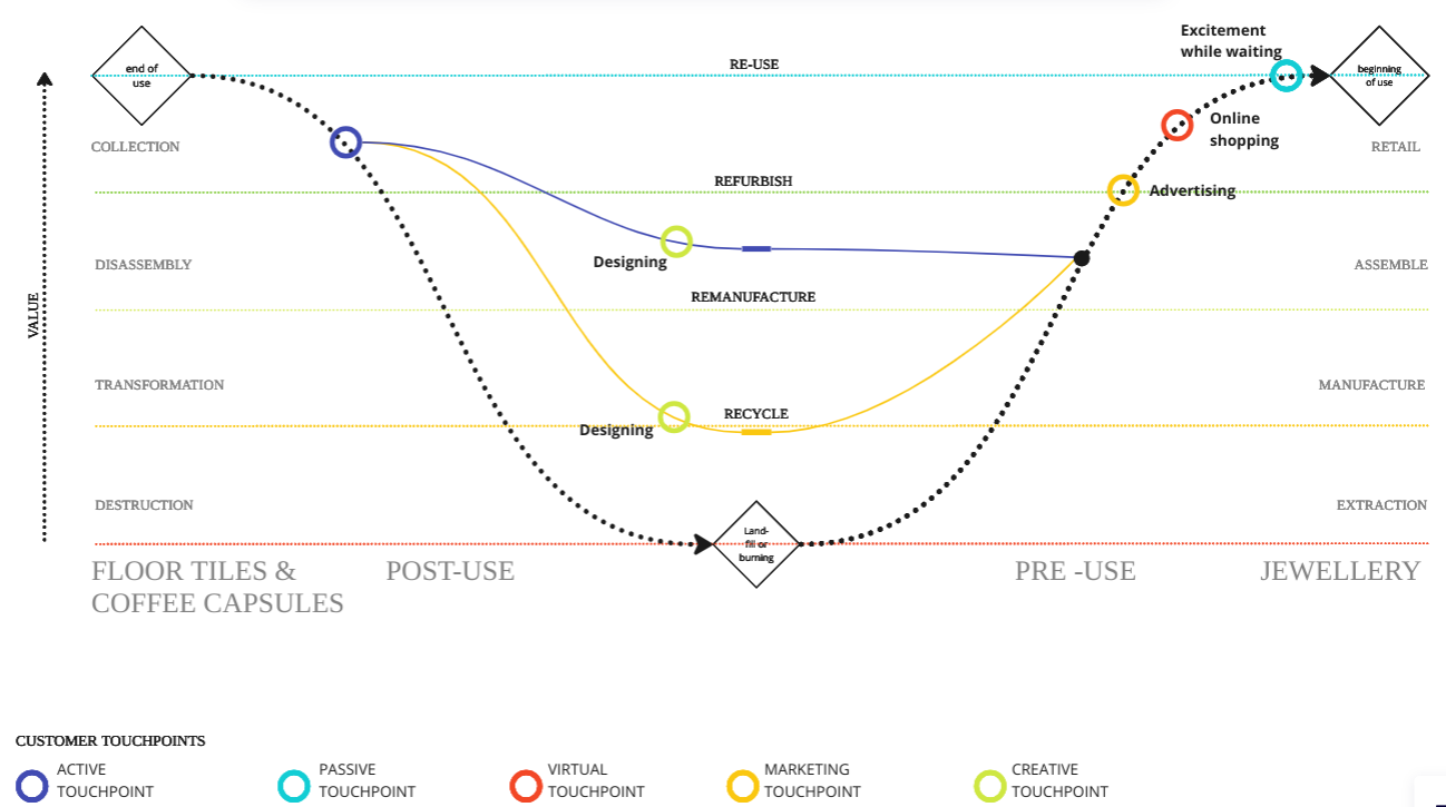 Starting with used coffee capsules and old floor tiles, our persona hands-in both to our recycling store. She either is payed a small amount of money for handing in her waste (incentive!) or the materials remain her's and she can design how the final product should look like. No more side products are needed! While the capsules need to be washed first, they afterwards are pressed and painted. That is, they need to go down until recycling. Floor tiles, however, just need to be cut into appropriate size, i.e., no recycling is needed. After advertising the new product, it is sold online. Finally, the client is waiting excitedly for her new jewellery to be delivered.